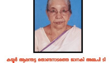 കയ്യൂർ ആലന്തട്ട തൊണ്ടനാടത്തെ ജാനകി അമ്മ.പി ടി (86 വയസ്സ്) നിര്യാതയായി.