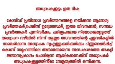 അധ്യാപകക്കൂട്ടം ഗുരു ദീപം *കോവിഡ് പ്രതിരോധ പ്രവർത്തനങ്ങളെ നയിക്കുന്ന ആരോഗ്യ പ്രവർത്തകർ,പോലീസ് ഉദ്യോഗസ്ഥർ, ഇതര ജീവനക്കാർ, സന്നദ്ധ പ്രവർത്തകർ എന്നിവർക്കും. ചരിത്രപരമായ നിയോഗമേറ്റെടുത്ത് അധ്യാപന വഴിയിൽ നിന്ന് ആതുര സേവനത്തിന്റെ പുതുവഴികളിൽ സഞ്ചരിക്കുന്ന അധ്യാപക സുഹൃത്തുക്കൾക്കൾക്കും പിന്തുണയർപ്പിച്ച് കൊണ്ട് സമൂഹത്തിലെ അജ്ഞതയെന്ന അന്ധകാരത്തെ അകറ്റി ജ്ഞാനപ്രകാശം ചൊരിയുന്ന ആയിരക്കണക്കിന് അധ്യാപകർ അധ്യാപകക്കൂട്ടത്തിൻ്റെ നേതൃത്വത്തിൽ ഒന്നിക്കുന്നു.*