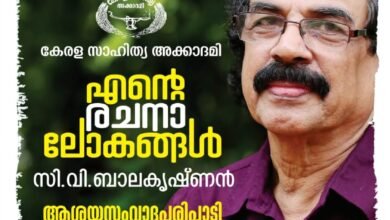 കേരള സാഹിത്യ അക്കാദമി ‘എന്റെ രചനാലോകങ്ങൾ ‘ എന്ന ആശയ സംവാദ പരിപാടി യുടെ ഭാഗമായി ചെറുവത്തൂർ പഞ്ചായത്ത് ഹാളിൽ വെച്ച് 20 ന് വെള്ളിയാഴ്ച 4 മണിക്ക് സി വി ബാലകൃഷ്ണന്റെ സാഹിത്യ ജീവിതത്തെ പ്പറ്റിയുള്ള സമ്മേളനം നടത്തുന്നു. സി.വി. ബാലകൃഷ്ണൻ തന്റെ സർഗ്ഗ ജീവിതത്തെപ്പറ്റി സംസാരിക്കും.